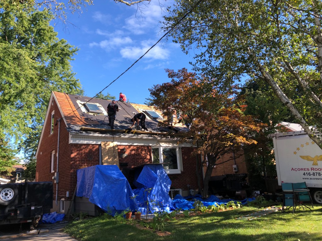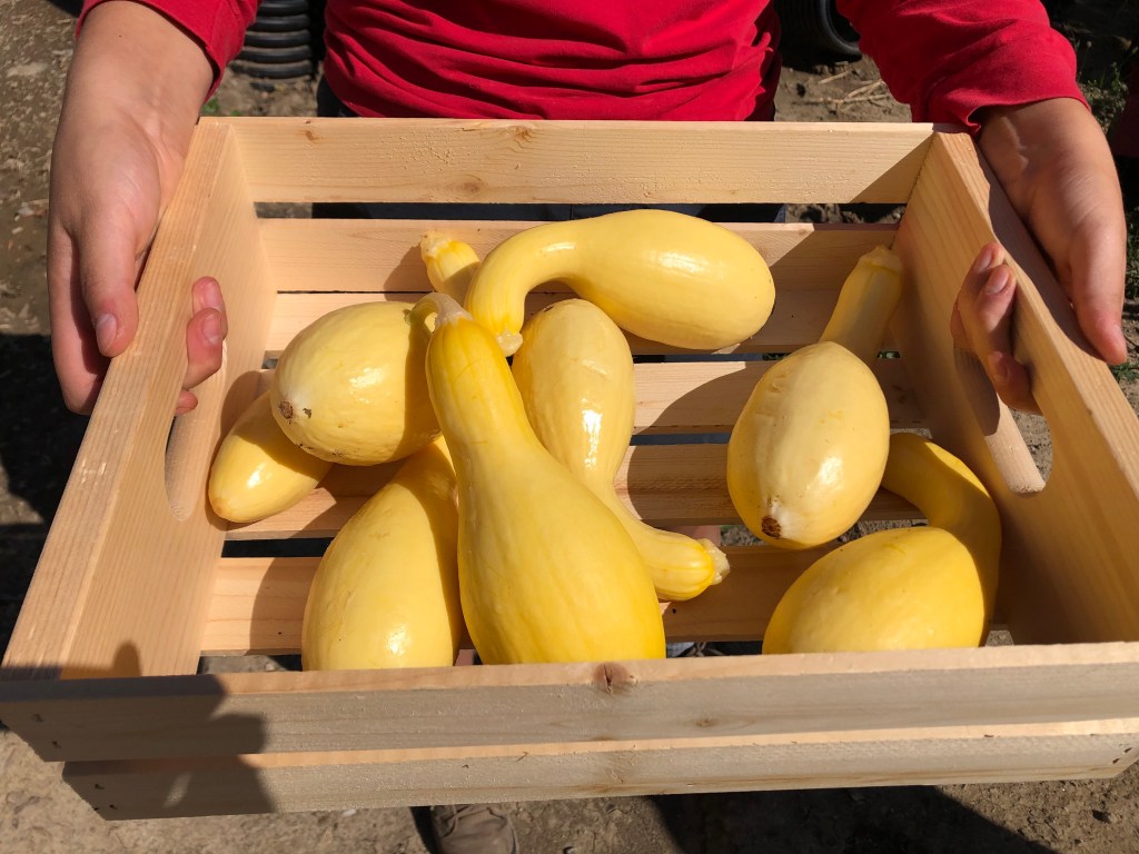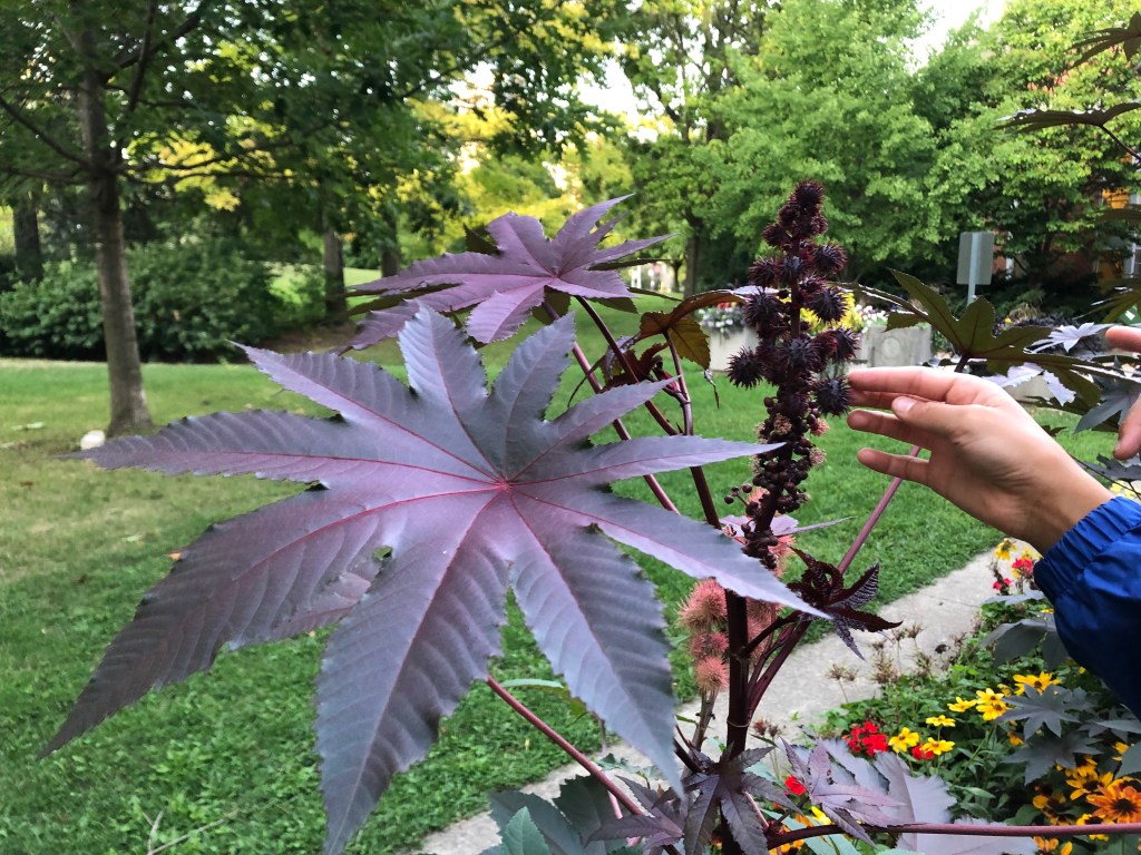 In their forays around the neighbourhood, the kids kept telling us about the chicken down the street. Not sure who on the street owns the chicken, but it’s often on the lawn of this house in the evenings.A friend in the neighbourhood has started an urban farm business at his house so we’ve been enjoying samples. These are summer squash we took home.A couple of days later, he delivered romaine, cucumbers and cauliflower. Organic and freshly harvested. Sooooo good! Although it looks like broccoli, the taste is all cauliflower. The sweetest stems ever!In one of the parks by the house, we discovered this giant-leafed ornamental plant …with crazy looking seeds. It’s a castor bean plant, and the crazy looking seed pods contain the toxin ricin, an extremely deadly natural poison.And … we had the roof re-shingled after putting it off for almost a year.It took them two days, the front was done on the second day.New vents in the roof, and you can see the progression of Lara’s pet project of a butterfly and bee friendly garden.