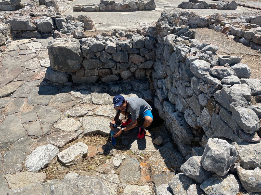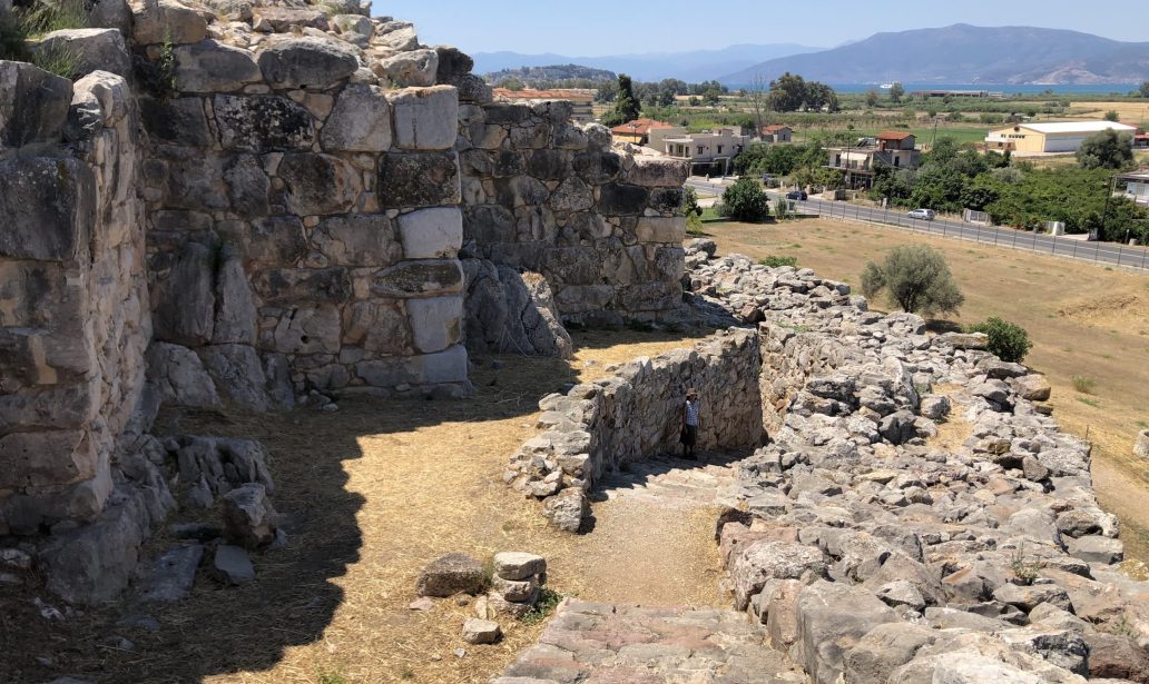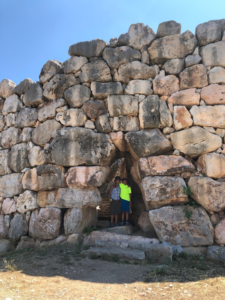 This is the citadel’s great entrance, up a huge ramp. Because Tiryns was only about 1.5 km from the sea, it controlled the major trade routes.The Niche, the size of a room.View of the cyclopean walls – “cyclopean” meaning a type of masonry using huge irregular blocks. It was named “cyclopean” due to the belief of ancient Greeks that it required Cyclops to move the massive blocks.Close up of the cyclopean walls. Many of the large blocks of limestone are 8-10 feet long, 3 feet thick, and 3 feet high. The interstices (space between blocks) were filled with clay and with small stones.We progressed slowly in the heat upwards, marvelling at the construction. Passing through the Great Propylon to the upper citadel. Some of these walls are 8 m thick! 😲From here, 28 m above sea level, there were breezes and a view of the Argolic Gulf in the distance,and opposite, a view of the olive groves.A favourite activity for the kids was to speculate where the bathrooms were. Just behind Nolan’s behind is the drain of the palace bathroom.Exploring the Great Courtyard in the upper citadel. To the left was the great courtyard, and on the right were the houses of the elite, their attendants and courtiers. Around this time, Nolan came running, yelling about people taking the suitcases out of the trunk of our car!! Neil and the boys sprinted back down back to parking lot while Lara and I followed at a slower pace.It turned out that another family had arrived, in the same colour and model car as we had, and parked right beside us in the empty parking lot. They were taking their luggage out of their trunk. 😅 Once our heart rates returned to normal, we explored the lower citadel, which had had more houses, and underground cisterns. Portals with corbeled arches (using overlapping stones to form an arch) like these were common along the walls of the lower citadel.