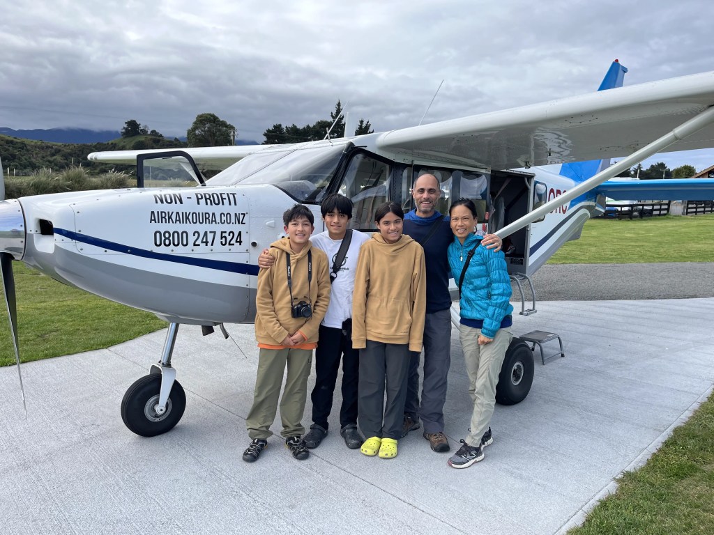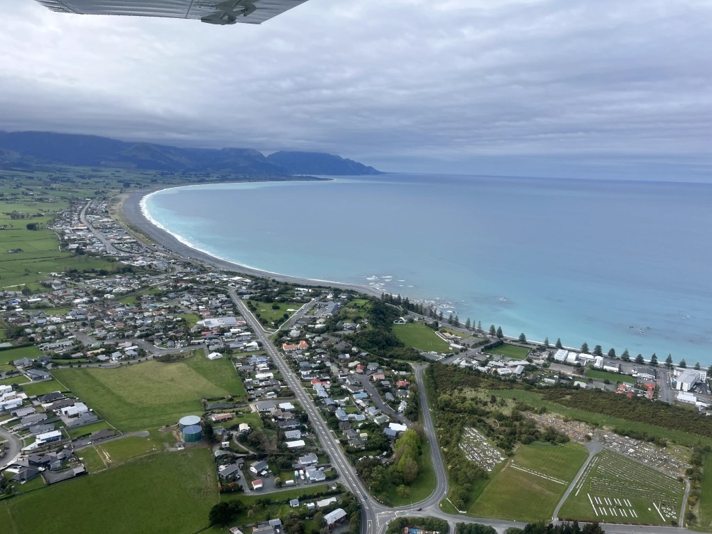 Our plane was a GA-8 Airvans, which can seat 8, including the pilots, and it was a private tour.The peninsula protrudes 5 km into the South Pacific ocean, and there’s an underwater canyon about 800 m off the coast that is over 1,200 m deep. The Maori people have lived here for about a thousand years; and the Europeans began settling on the peninsula for whaling in the 1800s. Whaling continued until it was banned around the 1920s.The name of the town is made up of two Maori words meaning eat (kai) and crayfish (koura). The land on the peninsula is now used mostly for cattle, sheep, and deer farming.We did the Kaikoura Peninsula Walkway along the coastline on another day. From the air, you can’t see all the seals and seabirds.View of the layered limestone terraces that have been exposed by tectonic movement. The rock at the top of the cliffs is the oldest while the rock appearing at the shoreline is the youngest.We then fly away from land to search for sperm whales, the largest toothed predators. The pilot explained that their pattern is diving for about 40 minutes to feed on giant squid in the deeper waters. The whales then surface, spout water, and re-oxygenate for about 5 minutes before diving again. Sometimes you can spot scars on the whales from the giant squid, which can be 10-13 metres long, fighting back. Ambergris is an aggregate of undigested squid parts (beaks and mantles) that’s been regurgitated by some sperm whales. It’s used in the west in perfumes, and in the east for medication. After much searching, we managed to see the tail of this sperm whale before it headed back to the deep. Since the flight is only 40 minutes and it’s not possible to predict where the sperm whales would re-surface, it was our only opportunity to see them. Photo by Nolan.We also saw a small pod of dusky dolphins – in the summer time, a pod can have hundreds of dolphins. Dusky dolphins are very playful and intelligent.Our other sighting was of a fellow whale watcher in a different vehicle.Spot our landing strip!Since Felix was on the opposite side of the whale and didn’t see it, the pilot offered to let him fly the next day since there was a seat free. However, since there was very minimal chance of seeing a whale the next morning, Felix declined to go. Nolan went instead, just to be in the air. Neil mentioned that Nolan wanted to be a pilot so he got to sit up front in the co-pilot’s seat! No whale or other sightings on that flight.