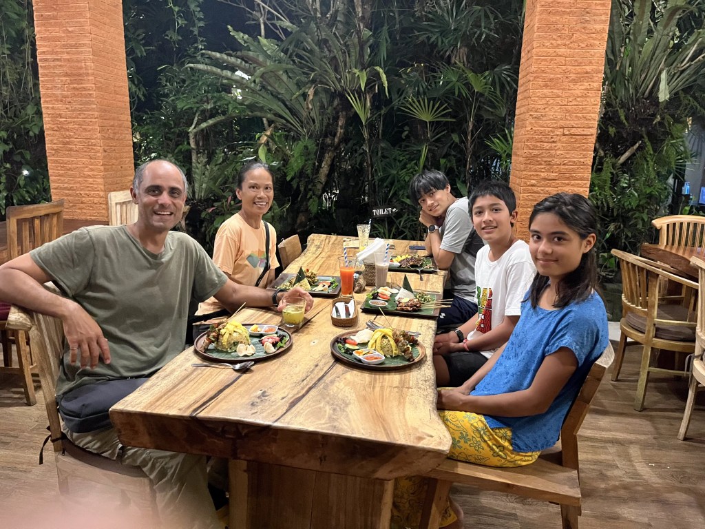 Christmas dinner at the Balinese Home Cooking restaurant a few minutes walk from home. The restaurant is part of a family clan compound (this is how traditional Balinese live and there were numerous compounds, even in Denpasar and Ubud). The restaurant’s owner was very friendly and told us that males stay in their home compound after getting married while females leave for the husband’s compound on marriage. His compound has 17 buildings containing 8 families (a total of 33 family members).