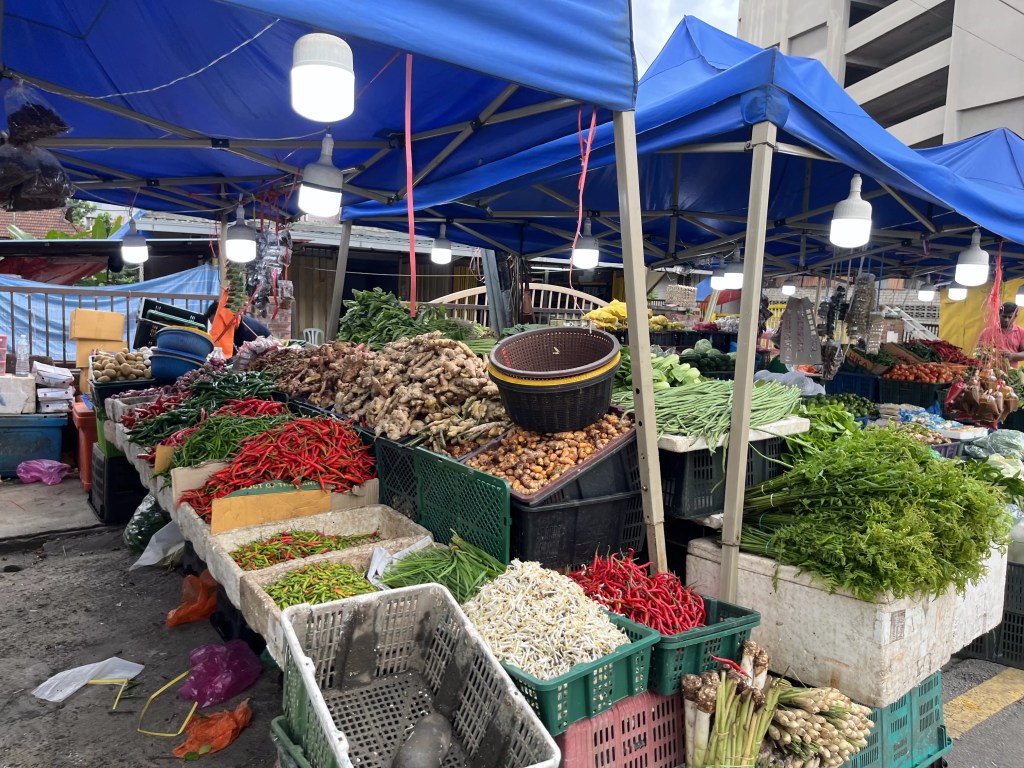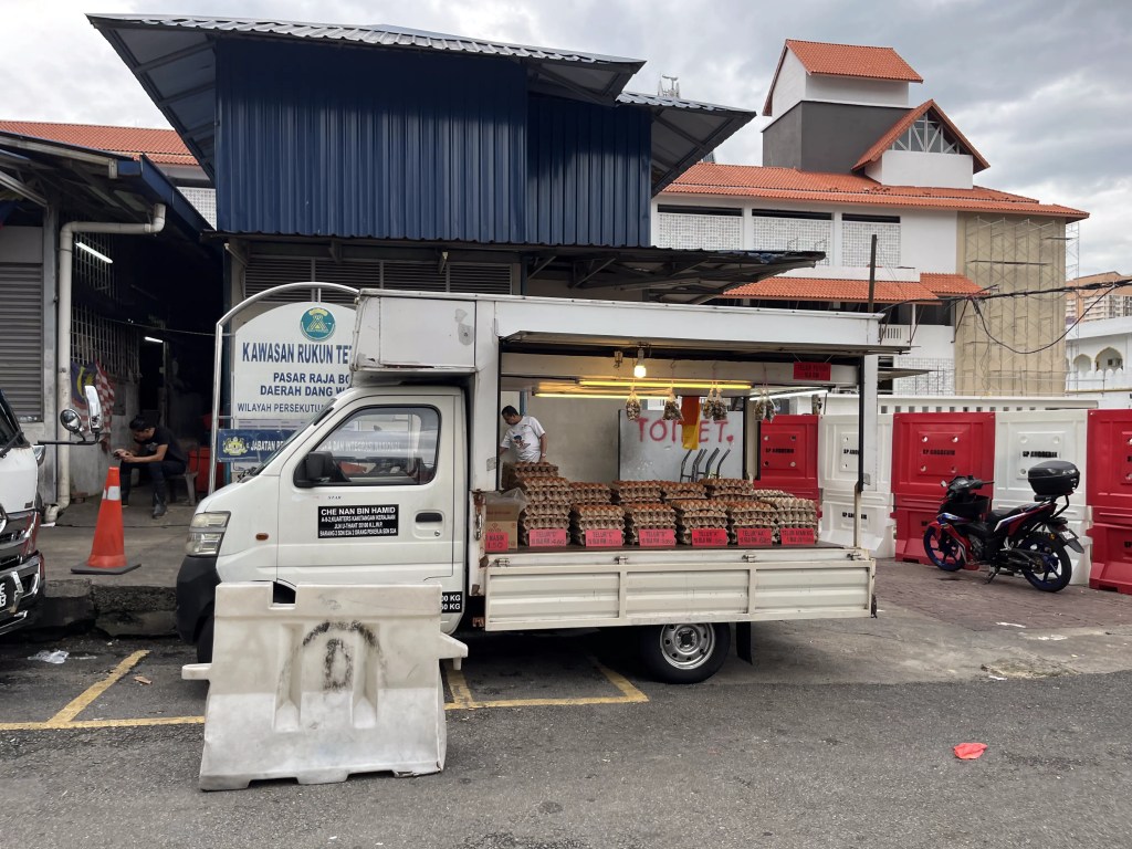 Shallots, galangal, garlic, different kinds of chillis, ginger, turmeric, lemon grass – all fresh and ready for rempah (a spice paste that’s used as a base for many dishes).Then came the fish stalls.Behind the fish stalls in the sheltered warehouse were stalls for meat. We didn’t venture in as it was the end of the day and only the ones lining the exterior were still open.Yellow chickensWhite chickensLive chickens. Very little goes to waste as the internal organs are used for satay (and probably other dishes too). One of the stalls selling beef. Yes, that’s are real dead cow head. Packaged meat for sale. We’re in a Muslim neighbourhood, so no pork in sight.The egg truck still had lots of stock.Coconut stall. The tilted bowls on the left are where he grinds the meat of the coconut. The shop keeper is extracting coconut milk at the machine. Fresh coconut milk makes a huge difference in foods.Dry goods stall has crackers, snacks, sauces, noodles, and rice.There are numerous fruit stalls. Longan, mangoes, jackfruit, guavas, rambutans, bananas, persimmons, pineapples, papaya, mangosteens, grapes, sugar apples …Apples, oranges, apple pears, limes. So much variety.