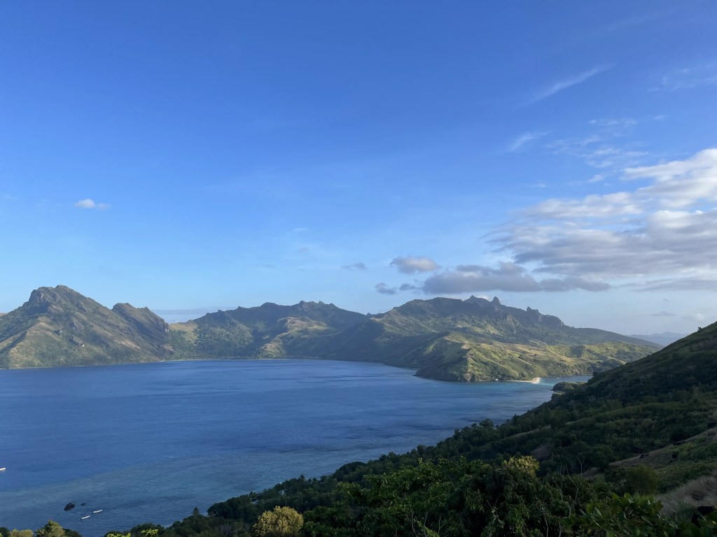 Sugarcane, bananaCassavaPapayaNot sure what these were but given their care, they are edible!Mangoes hiding in the trees.If you look closely, you can see Ben scaling the papaya tree to bring one home for breakfast.A water reservoir with taro growing in front.The way up was wild and overgrown, and Api and the boys had to scout a path in places.We’re on the right track!Looking at Waya Island.The sandy spit is under water.Wonder who lives in that house hidden in the trees?Our home is almost directly below us – the larger boat is what we’ll be taking back to Nadi on Fiji’s main island.The kids crowding around Nolan as he prepares to fly his drone.Family photo on top of the island.And then it was time to say our goodbyes. One last photo.And we’re off! This trip was on the choppiest seas we experienced in Fiji. We started out sitting on the benches, but were being thrown about on the waves. Bill eventually had us sit on the bottom of the boat (he also did the same). 1.5 hrs later, we arrived at Nadi Wharf, completely soaked! It’s quick to dry off in the Fiji sun.